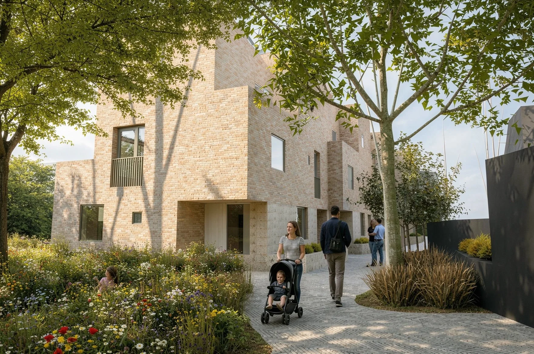 Each ground-floor flat will have a private garden directly accessible from the living room and master bedroom. Additionally, each flat will have its own private door accessed from a shared pedestrian "street" within the development.